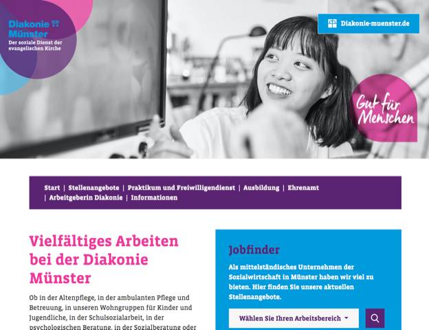 Münster, 20.05.2020. Das zeitgemäße Jobportal der Diakonie Münster ist an den Start gegangen. Die Bewerber*innen erhalten durch Fotostories, Videos und Informationen Einblicke in die vielfältigen Tätigkeitsbereiche des Trägers. Außerdem dauert eine Bewerbung nur wenige Klicks. Denn erfahrungsgemäß brechen laut einer Studie 85% der Bewerber*innen den Bewerbungsprozess ab, wenn er zu kompliziert ist. Auch „Backstage“ wurden Prozesse optimiert, um den Bewerber*innen den bestmöglichen Service zu bieten. Hier geht’s zum Jobportal >