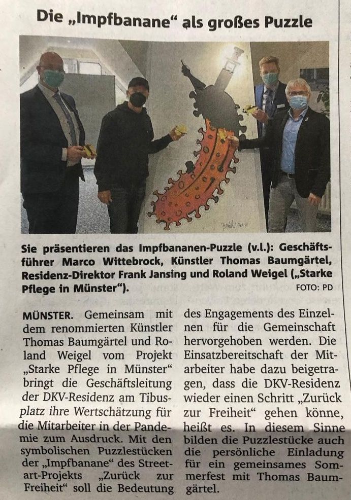Etwas anders wurde die Banane am 30. April in der DKV-Residenz am Tibusplatz präsentiert. Mit symbolischen Puzzlestücken der „Impfbanane“ soll die Bedeutung des Einzelnen für die Gemeinschaft hervorgehoben werden. So dienen die Puzzlestücke als persönliche Einladung für ein gemeinsamens Sommerfest mit dem Künstler. Die WN vom 3. Mai 2021 dazu: „Die Einsatzbereitschaft der Mitarbeiter habe dazu beigetragen, dass die DKV-Residenz wieder einen Schritt Zurück zur Freiheit gehen könne (…) .“