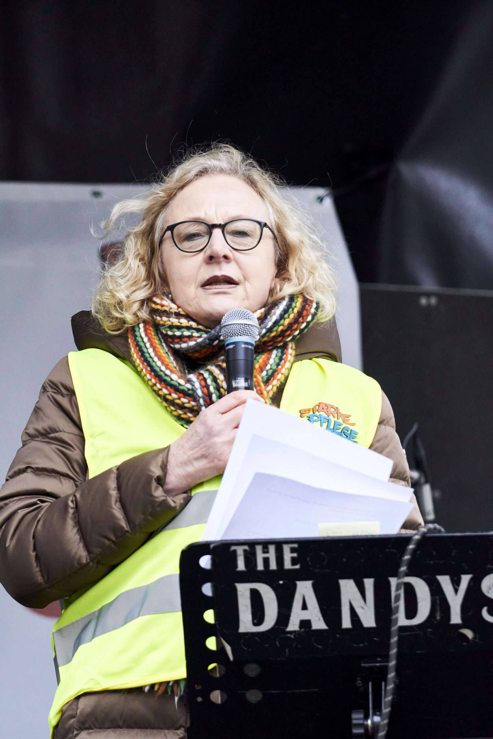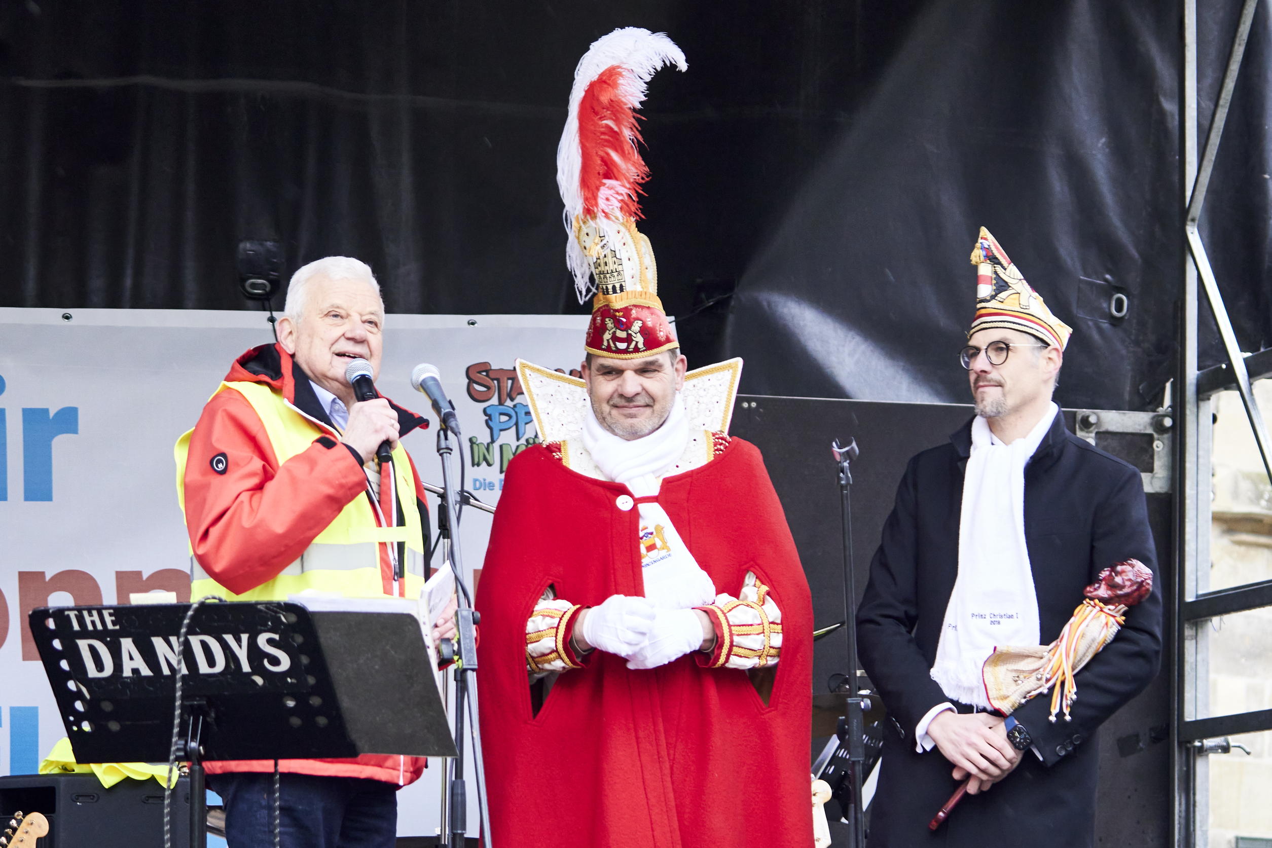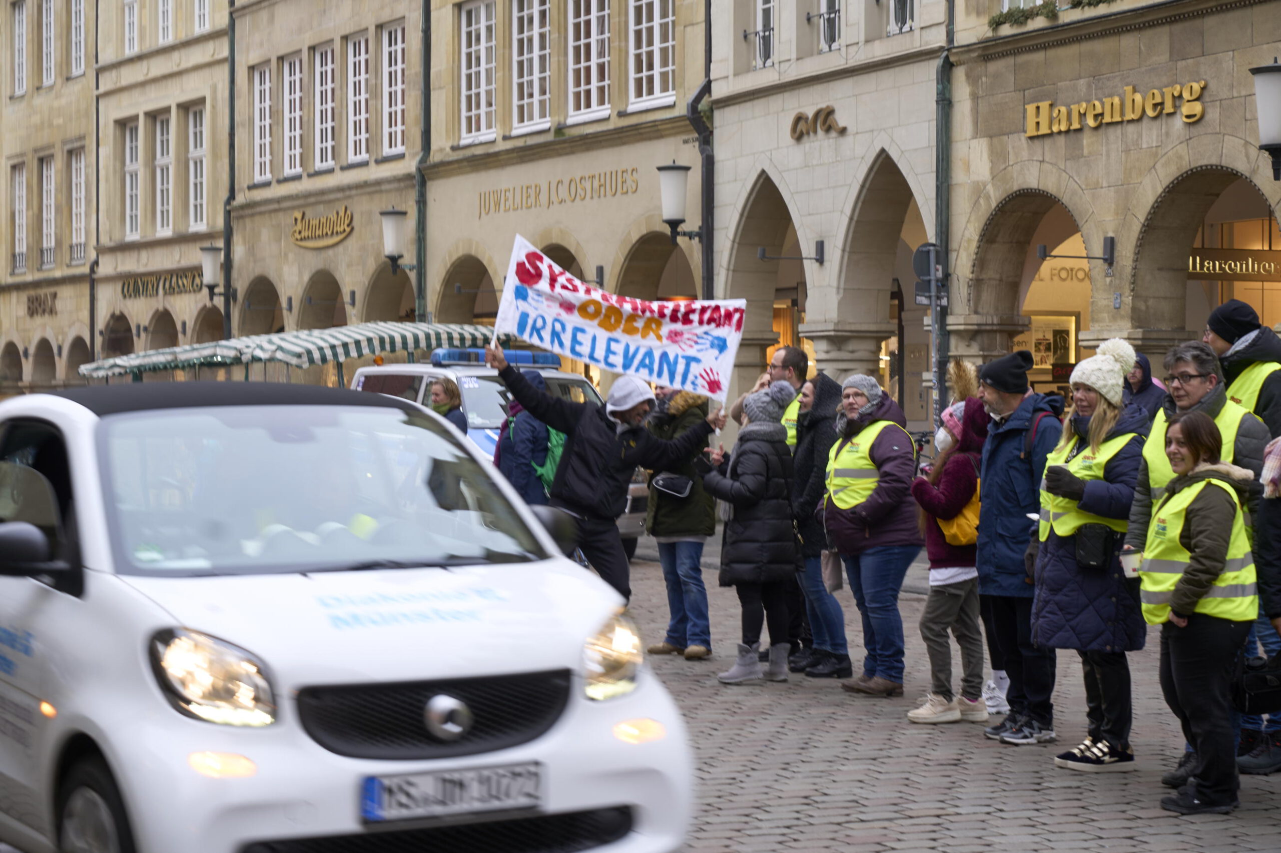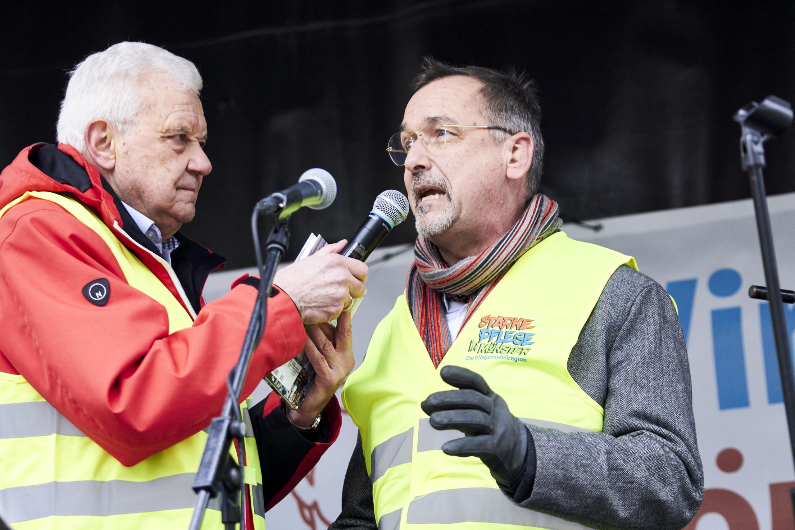 Das Bühnenprogramm (war der Hit, die Moderation war großartig, Bürgermeisterin Maria Winkel hat uns im Namen des Schirmherren den Rücken gestärkt, die Wortbeiträge von Uli Watermeyer, Norbert Nientiedt und den „Starken Typen“ mit ihrer musikalischen Untermalung haben unsere Anliegen auf den Punkt gebracht, der Karnevalsprinz hat Brücken geschlagen und der Autokorso war einfach nur großartig. Jemand hat doch tatsächlich 111 Fahrzeuge gezählt! Die Bilder und Botschaften, die wir übermitteln wollten, sind allesamt rübergekommen. Das war ein „Starkes Stück Pflege“! Danke auch an die Kirchengemeinde, die uns diesen symbolträchtigen Ort zur Verfügung gestellt hat. Danke auch an die DKV-Residenz für den „Unterstand“ und den Support der Hausmeister. Unser Dank gilt auch den Domfreunden, die uns die Türen zu vielen Menschen und Unterstützern geöffnet haben. Aber natürlich auch Dankeschön an alle Ordner*innen und sonstige Multiplikatoren, die während der Veranstaltung für Stimmung und die Verteilung unserer „give aways“ gesorgt haben. Die Bilder mit den Menschen in den gelben Warnwesten waren einmalig.