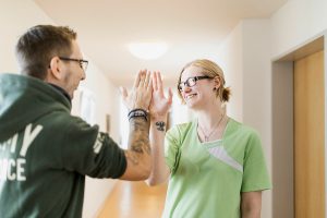 Ein Praktikum in der stationären Altenpflege hatte sie davon überzeugt, dass sie dort beruflich zu Hause sein würde. Dafür gibt es aus ihrer Sicht eine Reihe guter Gründe. „Es passiert jeden Tag etwas Neues.“ Sie erlebt die Arbeit nicht nur reich an Abwechslung sondern auch an Begegnung. „Man baut Bindungen zu den Leuten auf, du lernst den Menschen dann anders kennen. Sie haben so viel erlebt und erzählen darüber und immer bekommst du ein Lächeln …“. Es sind einerseits berührende Geschichten darunter, Erzählungen aus dem Krieg, leidvolle Erinnerungen an verlorene Männer und Kinder. „Man meint, man hat schon alles darüber gehört, aber wenn es dann direkt aus dem Munde der Menschen kommt, ist es etwas anderes …“. Andererseits erfährt Madita Kauling auch von spannenden Biografien. Sie erzählt von der Fotografin aus Münster, jetzt fast 90. Früher hat sie im Krankenhaus gearbeitet, zunächst in der Pflege, hat dann aber Fotografie studiert, Mitarbeiter porträtiert und Aufnahmen in der Chirurgie gemacht.