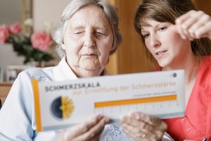 Was macht eine Pain Nurse genau? Die Herausforderung des Berufes ist es, Schmerzen zu erkennen und zu erfassen, ohne dass sich manche Bewohner noch äußern können. Man muss den Bewohner gut kennen, als gute Inforessource dienen auch die Angehörigen. Dann schaut man auf gewisse Verhaltensmerkmale. Was hat sich verändert? Der Gesichtsausdruck, erhöhter Blutdruck, weinen, Appetitlosigkeit, Unruhe – all das können Indikatoren für einen Schmerz sein. Man braucht dafür eine gute Beobachtungsgabe. Anhand festgelegter Kriterien erfasst man den Schmerz, und zwar in einer Ruhesituation (z.B. im Bett) und in einer Belastungssituation, z.B. wenn ein Bewohner in den Rollstuhl mobilisiert wird. Man kann dabei genau sehen, ob etwas unangenehm für den Schmerzpatienten ist.